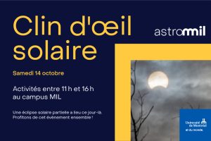 The tradition of AstroMIL, the celebration of astronomy on the MIL campus of the Université de Montréal organized each year by the Trottier Institute for Exoplanet Research in collaboration with numerous partners, continues this year, with the theme “Solar wink“! A unique opportunity to experience a partial solar eclipse with us, and to prepare for the great total eclipse of 2024!