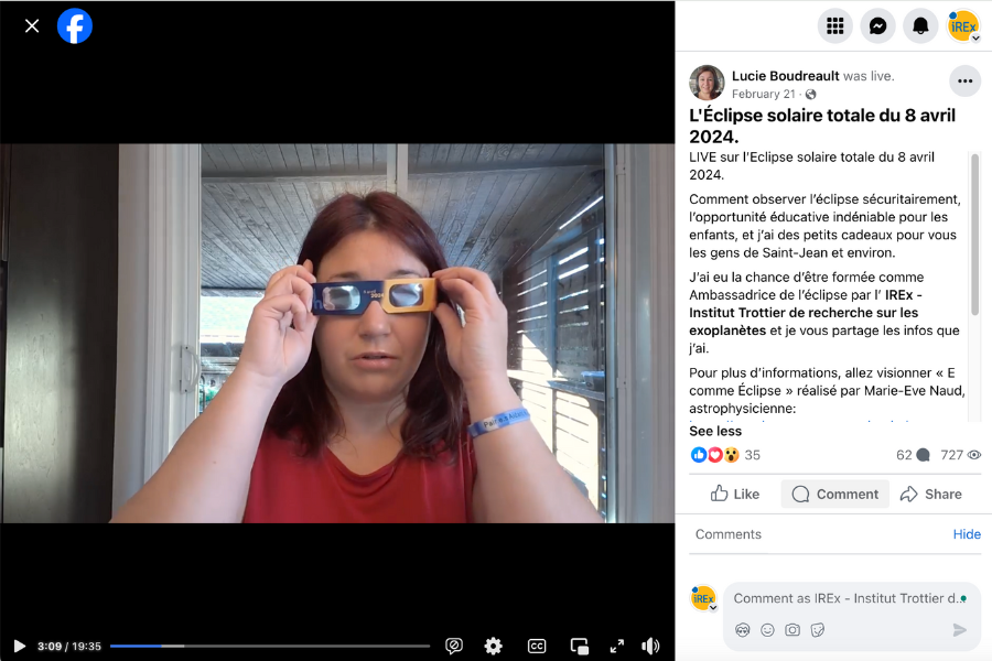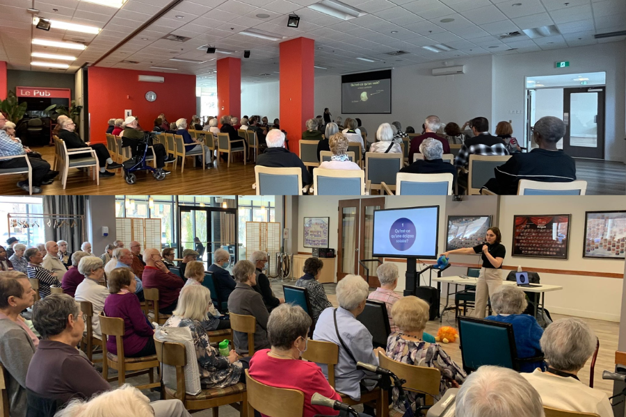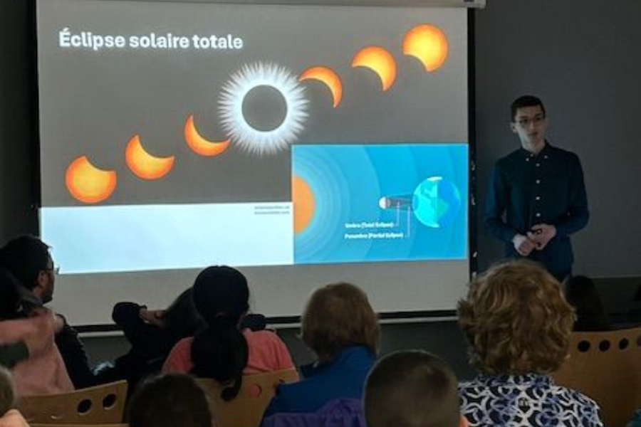 Long before the big day, the ambassadors were already hard at work, taking part in events such as the AstroMIL on October 14 2023 and the iREx Grande conférence on March 27 2024 as volunteers. Many also took the initiative of delivering presentations on eclipses in primary and secondary schools, scout groups, senior centres, libraries, municipalities, community centres, online and even in their own homes! Others used social media to share their enthusiasm for this unique and rare phenomenon. Finally, around sixty of the ambassadors agreed to distribute eclipse glasses before April 8th, enabling over 3,500 more people to be well-equipped to observe the Sun in complete safety.