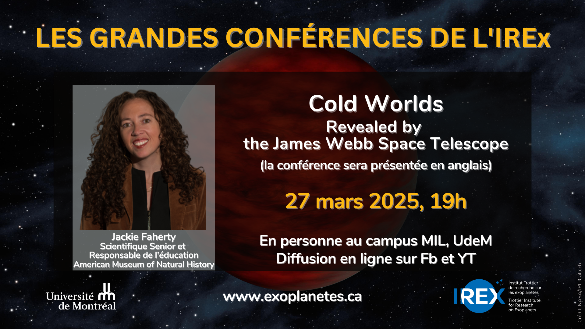 Joignez-vous à nous à l’édition 2025 de la Grande conférence de l’IREx, Cold Worlds Revealed by the James Webb Space Telescope (Les mondes froids révélés par le télescope spatial James Webb), pour explorer ces fascinants mondes froids. La conférence aura lieu le 27 mars 2025 à 19 h. Elle sera présentée en anglais par Jackie Faherty, scientifique senior et responsable de l’éducation au American Museum of Natural History (AMNH) de New York, qui vous emmènera dans un voyage passionnant à la découverte de certains des mondes les plus froids de notre univers.